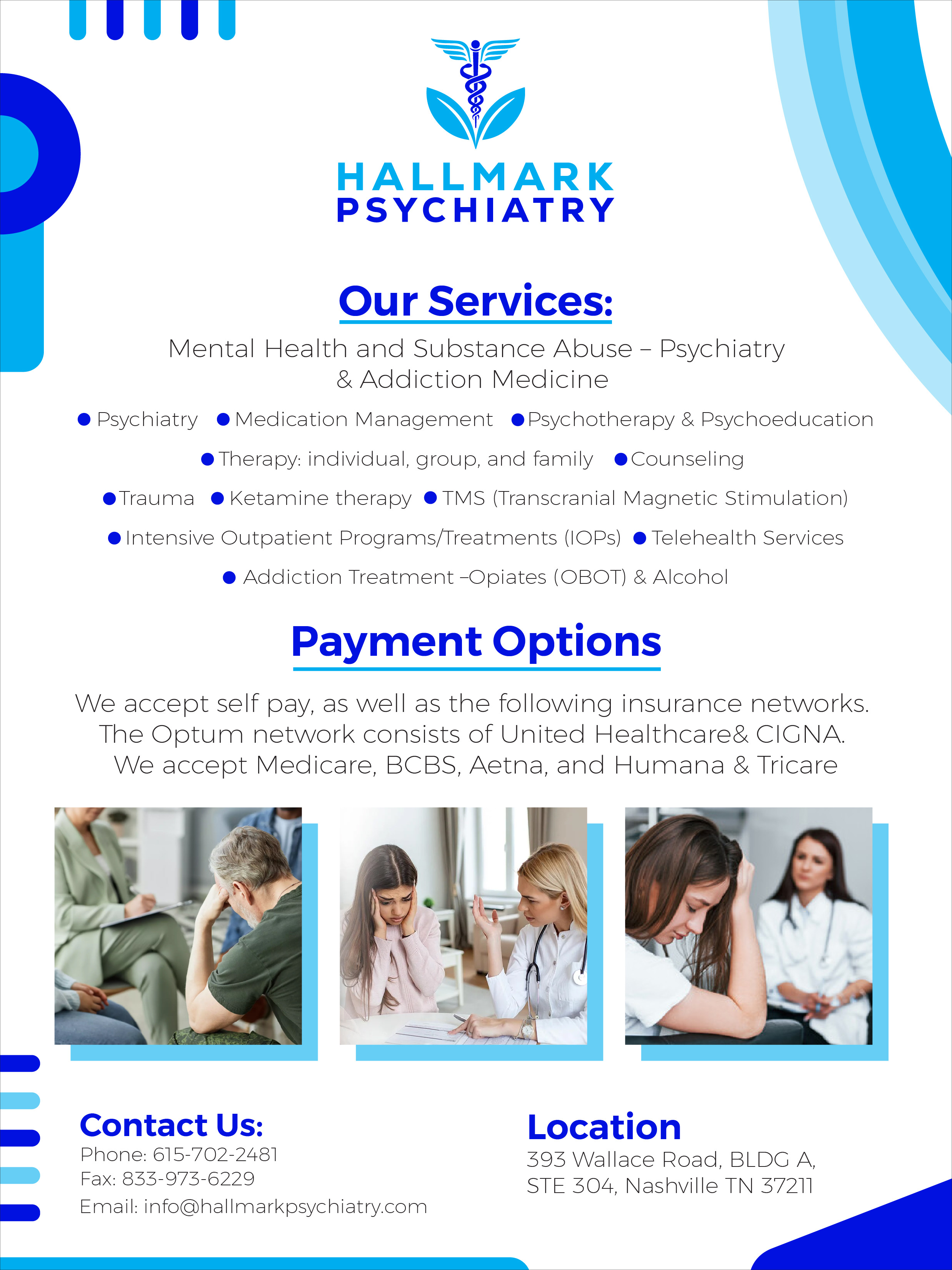 As a trusted mental health clinic, we offer a wide range of services tailored to support emotional and behavioral well-being. Our team provides individualized care based on your unique needs. We serve individuals looking for assistance through our ADHD treatment clinic, anxiety treatment service, or addiction medical clinic, ensuring support is available for various stages of personal development and recovery. For those interested in advanced options, we also offer coordination with a TMS clinic when appropriate. If you’re searching for an experienced psychiatrist or a compassionate team to support your mental wellness, Hallmark Psychiatric Consultants P.C. is here to help. With over 5 years in business, we are a Better Business Bureau (BBB) certified company that accepts most insurance plans and welcomes self-pay clients with flexible payment options. We are dedicated to walking alongside each person with care, respect, and a commitment to long-term well-being. Give us a call today.